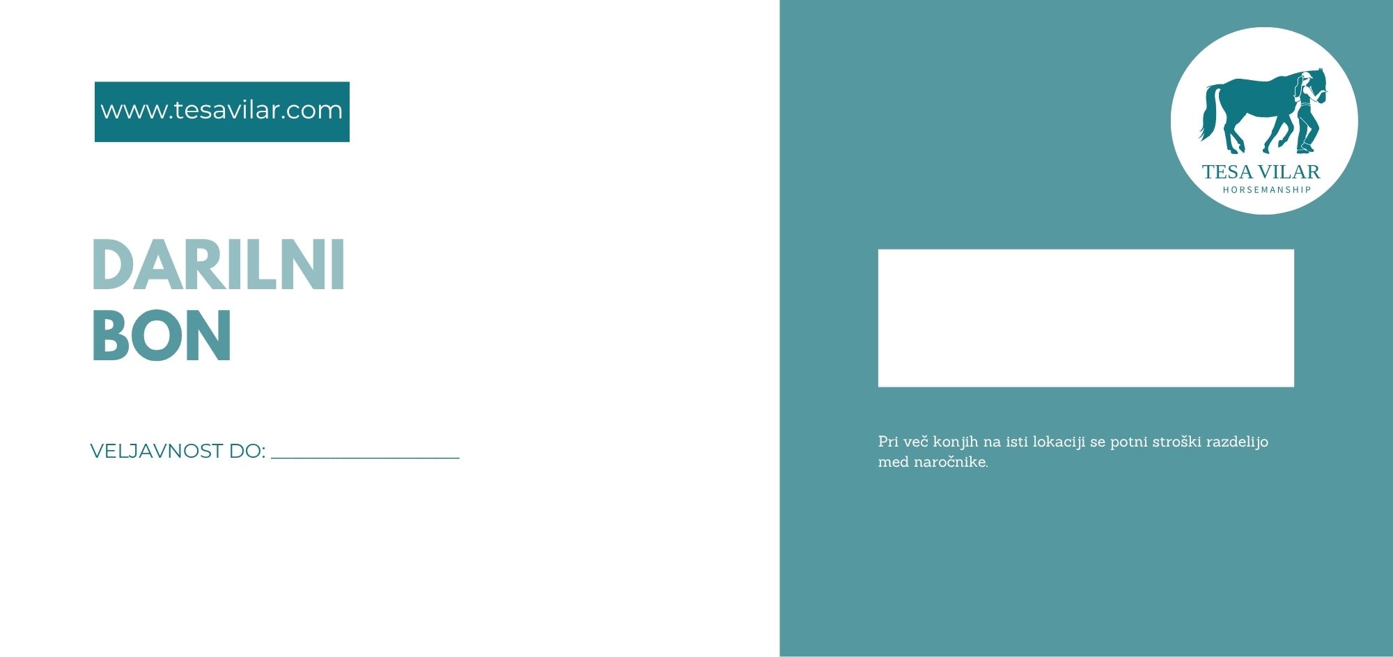 Darilni bon Tesa Vilar Horsemanship je primerno darilo za vse, ki si želijo pridobiti novih znanj, izboljšati odnos s svojim konjem in pri tem uporabljati konju prijazen pristop, brez prisile.